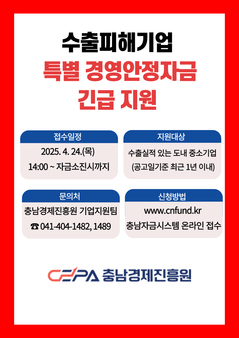 ▲ 수출피해기업 특별 경영안정자금 긴급 지원 공고 포스터 충남경제진흥원(이하 진흥원)은 최근 트럼프 전 대통령의 보호무역 주의 확산 등으로 급변하는 글로벌 통상환경에 대응하고, 도내 수출기업의 경영 부담을 완화하기 위해 ‘수출기업 경영안정자금’을 신설해 지원한다고 밝혔다. 이번 자금은 공고일 기준 최근 1년 이내 수출 실적이 있는 제조업 중소기업을 대상으로 하며, 기업당 최대 5억 원 한도 내에서 2년간 연 2%의 이자를 지원한다. 수출기업 전용자금으로는 최초로 마련된 이번 자금은, 미국 관세 등으로 어려움이 예상되는 기업을 신속하게 지원하기 위해 추진되었다. 김찬배 진흥원장은 “급변하는 통상환경 속에서 수출기업이 경쟁력을 유지할 수 있도록 신속하게 자금 지원을 추진했다”며 “앞으로도 해외사무소, 충남FTA통상진흥센터 등 진흥원이 보유한 다양한 인프라를 활용해 수출기업의 시장개척을 적극 지원하겠다”며 말했다. 자금을 신청하고자 하는 기업은 충남 소재 금융기관과 대출 상담을 진행한 뒤, 관련서류를 갖추어 충남자금시스템(www.cnfund.kr)을 통해 신청하면 된다. 자세한 사항은 진흥원 기업지원팀 ☎ 041-404-1484로 상담받을 수 있다. |