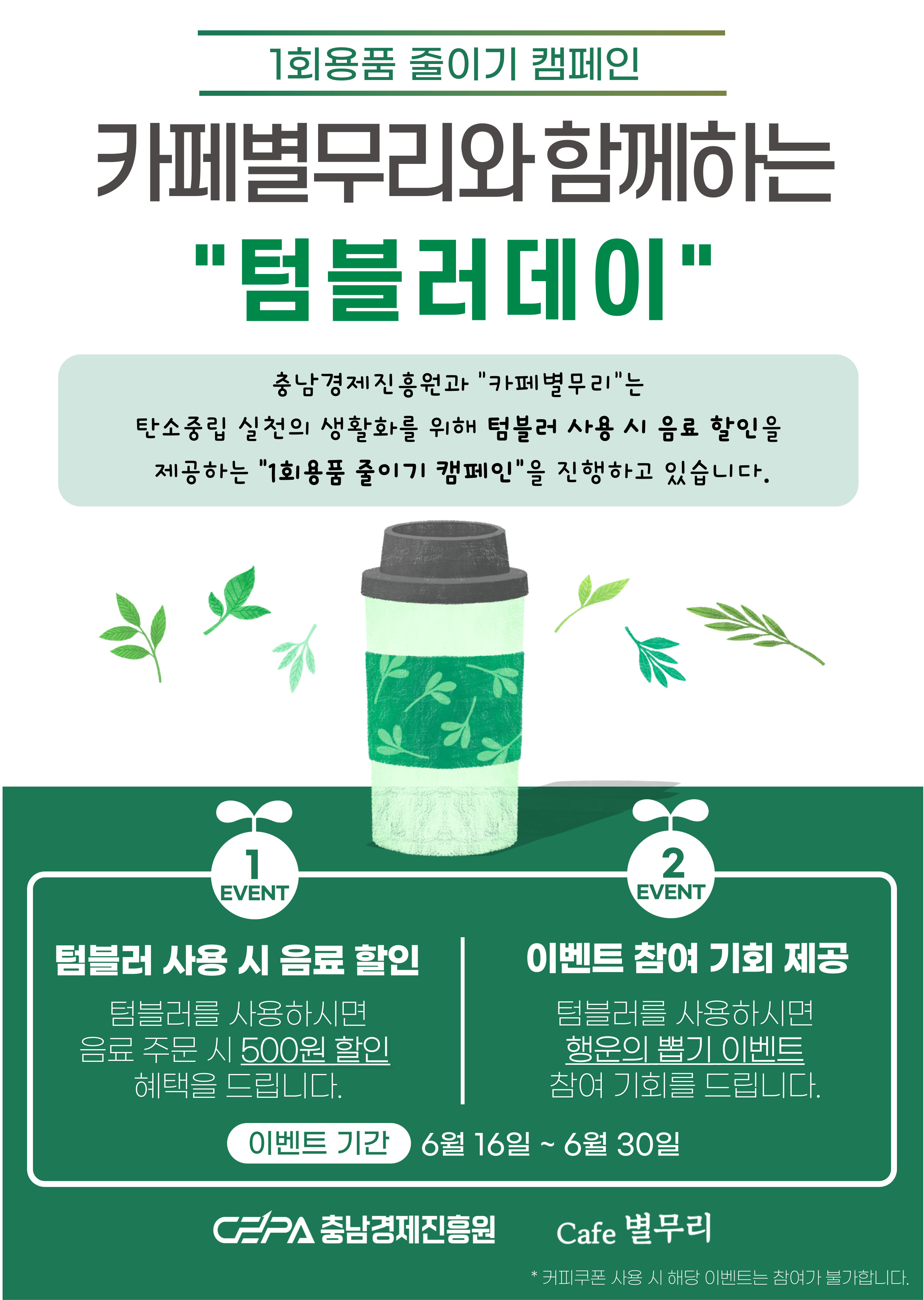 충남경제진흥원(원장 김찬배, 이하 진흥원)은 탄소중립 실천과 ESG경영 확산을 위한 생활 속 실천 활동의 일환으로, 청사 내 운영 중인 카페별무리에서 6월 16일부터 30일까지 ‘1회용품 제로화 캠페인’을 전개한다고 밝혔다. 이번 캠페인은 개인컵 사용 문화의 확산과 친환경 생활 습관 정착을 통해 일상 속 탄소배출을 저감하고 자원순환을 실현하고자 마련됐다. 캠페인 기간동안 카페별무리를 이용하는 진흥원 임직원과 방문객은 텀블러나 머그컵 등 다회용 컵을 사용하면 음료 1잔당 500원의 할인 혜택을 받을 수 있다. 김찬배 원장은 “1회용품 제로화는 단순한 캠페인을 넘어 지속가능한 ESG경영 실천의 핵심과제.”라며 “진흥원은 1회용품 사용 감축을 위해 실태조사, 임직원 인식개선 교육, 텀블러세척기 설치 등 다각적인 노력을 기울이고 있다.”고 강조했다. ‘카페별무리’는 진흥원이 스타벅스코리아, 더베이크 등 민간기업과 협력해 운영 중인 재능기부형 카페로 노인ㆍ청년ㆍ경력단절여성 등 다양한 세대의 통합 일자리를 창출하며 성공적인 사회적 모델로 자리매김하고 있다. 카페별무리는 2024년 진흥원 청사 내 개소한 이후, 올해 천안 독립기념관 내 2호점을 개점하는 등 지역 내 의미있는 일자리 확산에 힘쓰고 있다. 진흥원은 이번 캠페인을 통해 1회용컵 약 1,000개 감축과 약25㎏의 탄소(CO₂e)를 저감할 수 있을 것으로 기대하고 있으며, 이를 계기로 청사 내 친환경 문화 정착은 물론 지역사회 전반으로 ESG 가치가 확산될 수 있도록 지속적 노력을 이어나갈 방침이다. 또한, 이번 6월 캠페인을 시작으로 오는 9월과 11월에도 정기적인 캠페인을 운영하여 생활 속 탄소 저감과 자원순환 실천을 확산시켜 나갈 계획이다. |