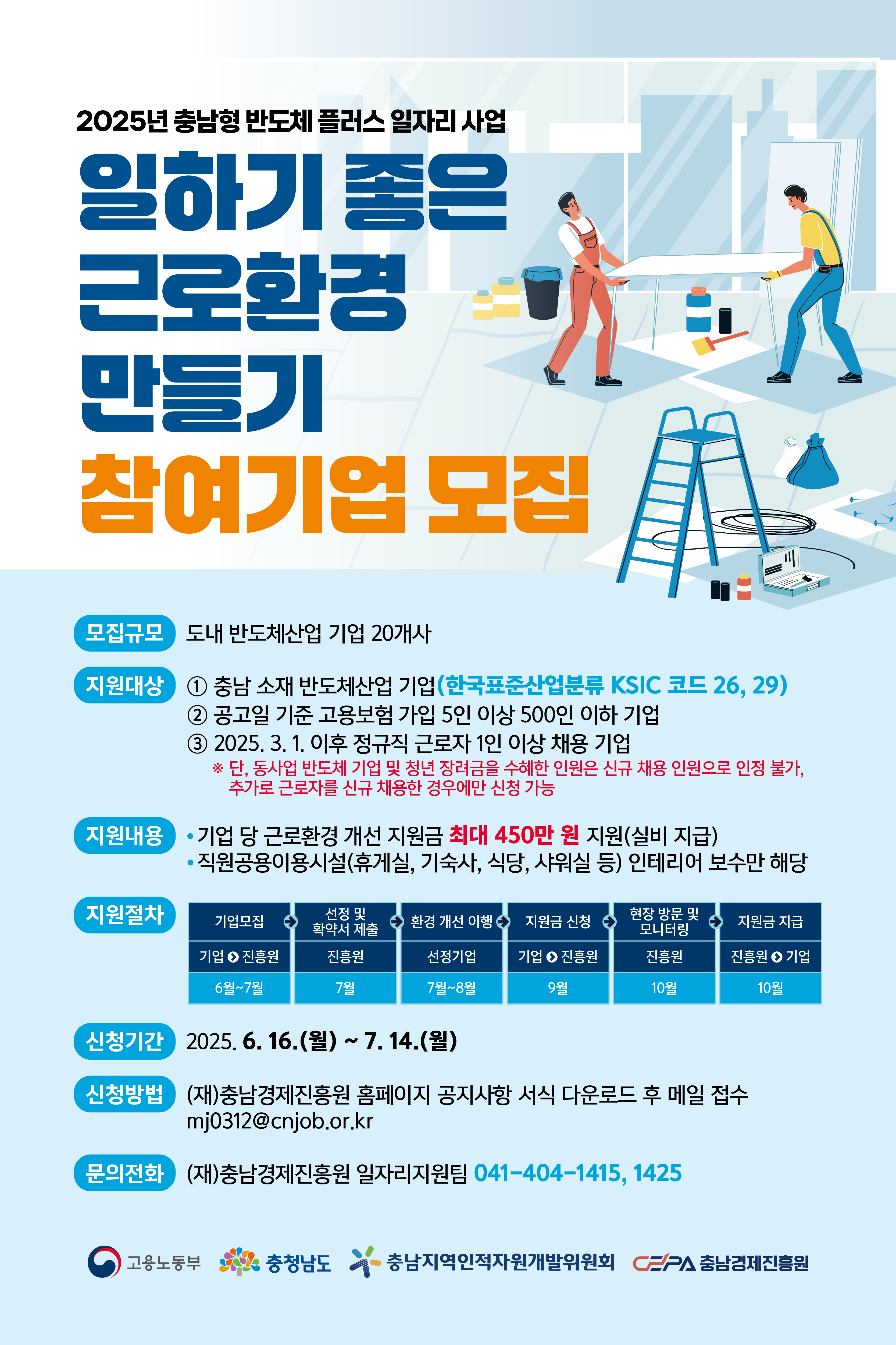 (재)충남경제진흥원(이하 진흥원)이 반도체 산업 근로환경 개선과 채용 활성화를 위해‘2025년 충남형 반도체 플러스 일자리 사업 - 일하기 좋은 근로환경 만들기’사업을 본격 추진한다. 이번 사업은 충남 도내 반도체 관련 기업을 대상으로 근로환경 개선을 위한 지원금을 제공하고, 이를 통해 구직자의 기업 인식 제고 및 신규 취업 촉진을 도모하는 데 목적이 있다. 진흥원은 6월 16일(월)부터 7월 14일(월)까지 해당 사업에 참여할 도내 반도체 기업 20개사를 모집하며, 선정된 기업에는 최대 450만 원의 근로환경 개선 지원금이 지원된다. 지원은 직원 공용 이용시설(휴게실, 기숙사, 식당, 샤워실 등)의 인테리어 보수에 한정되며, 사업 참여 신청 시 제출한 개선계획서의 내용을 실제로 이행한 기업에 한해 지원금이 지급된다. 참여 자격 요건은 다음과 같다. 충남 도내 소재 반도체 산업 기업으로, ▲ 한국표준산업분류(KSIC) 코드 26 또는 29에 해당하는 업체 ▲ 공고일 기준 고용보험 가입자 수 5인 이상 500인 이하 기업 ▲ 2025년 3월 1일 이후 정규직 근로자 1인 이상 채용한 기업 (재)충남경제진흥원 관계자는 “이번 사업은 반도체 산업의 경쟁력을 높이는 동시에, 지역 내 청년들에게 매력적인 일자리를 제공하는 마중물이 될 것”이라며, “도내 반도체 기업들의 많은 관심과 참여를 기대한다”고 전했다. 참여를 희망하는 기업은 오는 7월 14일까지 신청할 수 있다. 단, 2025년 한시적으로 운영되는 사업인 만큼 예산 소진 시 조기 마감될 수 있다. 자세한 내용은 충남경제진흥원 공식 홈페이지(https://www.cepa.or.kr/)에서 확인할 수 있다. ※ 담당자 : 충남경제진흥원 일자리지원팀 양희연 대리 |