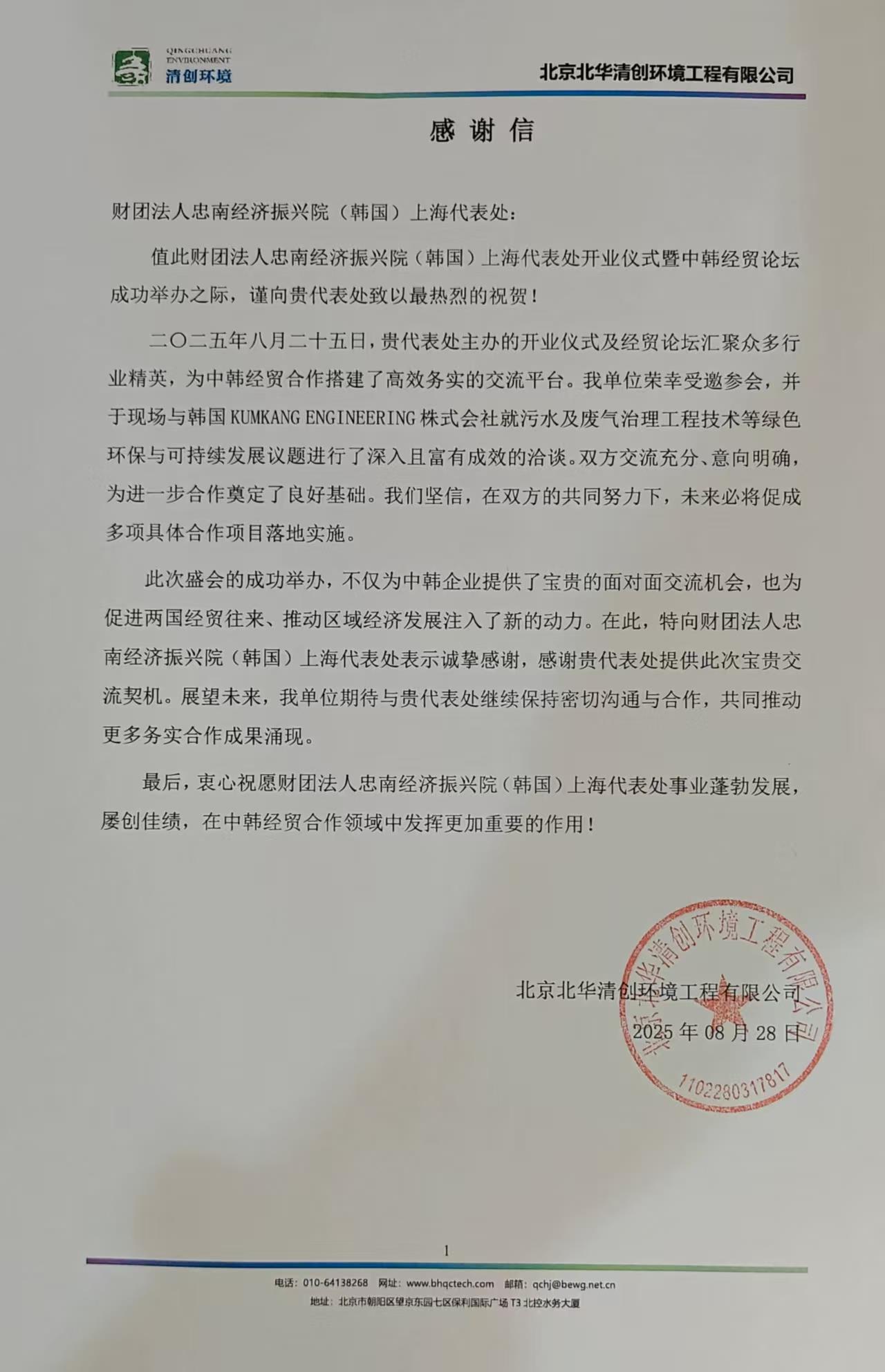 ▲ 중국사무소로 전달된 중국 기업의 감사편지 충남 기업과 기술협력 MOU를 체결한 중국 기업이 충남 중국사무소에 감사 편지를 보내 눈길을 끌고 있다. 충남에 소재한 금강엔지니어링(주)(천안시, 대표 정선용)은 지난 8월 25일 열린 충남 중국(상하이) 해외사무소 개소식에 참가하기 위해 중국을 방문했다. 이번 행사는 충남의 7번째 해외사무소인 중국(상하이) 해외사무소의 개소를 기념하기 위해 개최되었으며, 충남-장수성 우호 협력 20주년 기념 기업교류회가 연계 개최되었다. 개소식에 앞서 22일 난징에서 개최된 기업교류회에서 금강엔지어링은 중국의 베이징북화청창환경공정유한공사(北京北华清创环境工程有限公司)를 만나게 되었다. 중국 기업은 금강엔지니어링의 기술에 큰 관심을 보였으며, 두 기업은 양사의 기술 협력을 지속적으로 이어가기 위해 현장에서 MOU를 체결하게 되었다. 이후 MOU를 체결한 중국 기업은 25일 열린 상하이 사무소 개소식 현장에도 방문하는 등 적극적인 협업 의지를 비치며 기술협력에 대한 이야기를 이어갔다. 이후 MOU를 체결한 베이징북화청창환경공정유한공사는 충남 기업을 소개해준 충남 중국 사무소와 충남경제진흥원에 편지를 보내는 등 감사의 마음을 표했다. 중국 기업은 편지를 통해 충남 중국사무소의 초청으로 인해 금강엔지니어링을 만나 향후 긴밀한 협력을 기대하고 있다며 행사 개최를 통해 만날 수 있게 해주어 감사하다고 전해 눈길을 끌었다. 또한, 편지를 통해 충남경제진흥원과 중국 상하이 사무소가 한중 경제 무역 협력 분야에서 더 중요한 역할을 해주길 바란다는 인사를 전했다. 이외에도 이번 행사에 참여한 많은 충남 기업들도 중국 기업과의 협업을 확대하는 성과를 얻었다. 유로메디코스매틱(천안시, 대표 김남현)은 중국의 산동란화 그룹과 화장품 품목에서 100만 달러 규모의 수출MOU를 체결하고 행사 직후 산동성의 란화 그룹 본사로 초청받았다. ㈜소문난 삼부자(홍성군, 대표 구교민)도 중국 기업에 마른김 1200만 달러 규모의 수출MOU 협약을 맺고 수출을 앞두고 있다. 또한, 반도체 장비 기업인 하이쎄미코(주)(아산시, 대표 한민석)도 중국 기업과 만나 교류 협력을 확대하기 위한 MOU를 체결하게 되었다. 충남경제진흥원 관계자는 “중국 사무소 개소와 동시에 충남 기업에게 좋은 소식이 있어서 앞으로 충남 중국 사무소에서 많은 성과가 있을 것으로 기대한다.”라며, “일회성 행사지원이 아닌 지속적인 수출지원을 위해 노력하겠다.”고 밝혔다. |