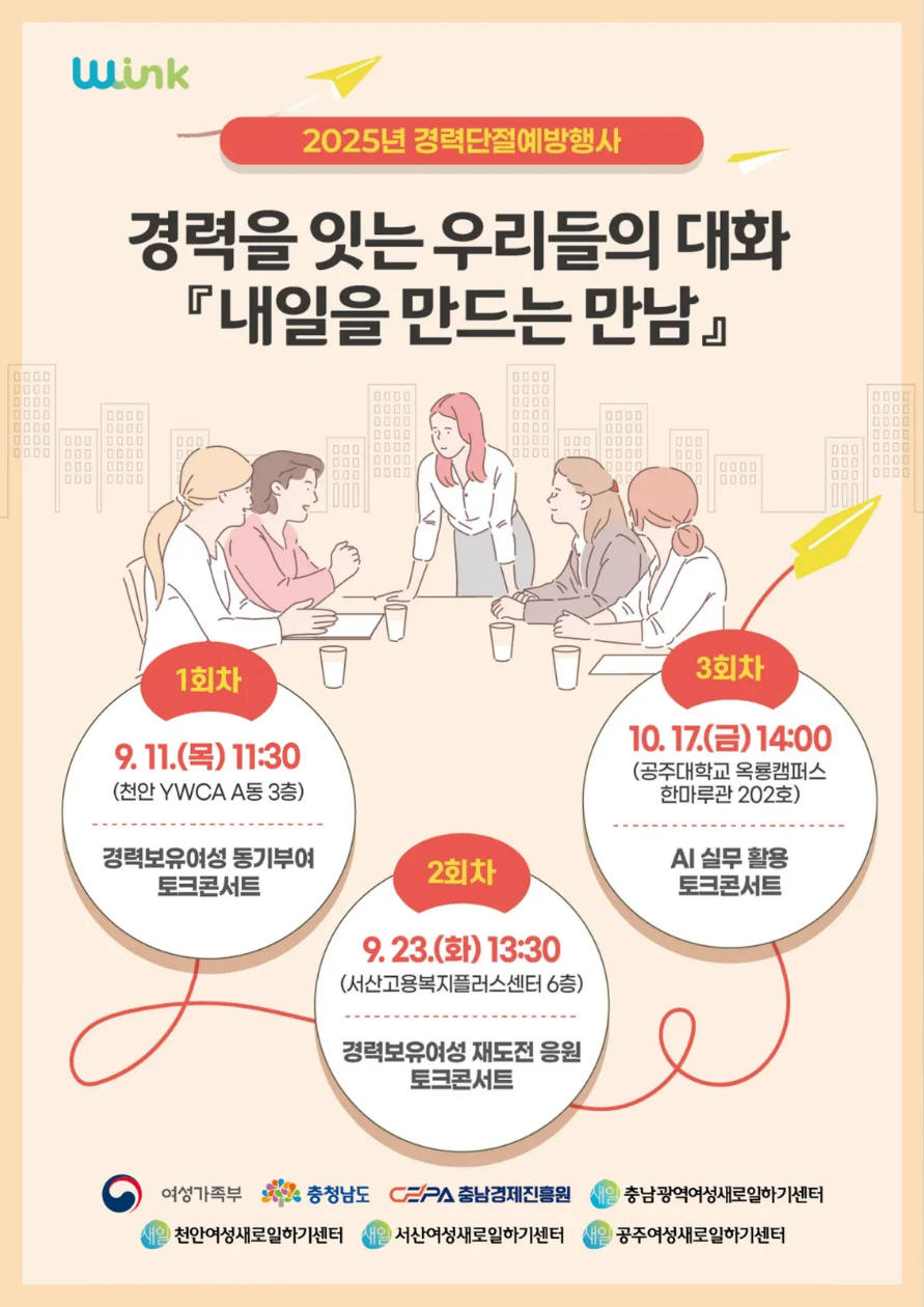 (재)충남경제진흥원(이하 충남광역새일센터)‧천안‧공주‧서산새일센터가 △경력단절예방 인식개선의 일환으로 여성의 경력 유지와 재취업 기회 확대를 위해 토크콘서트(경력을 잇는 우리들의 대화, 내일을 만드는 만남)를 추진한다고 밝혔다. 이번 토크콘서트는 기관 간 연계와 협업을 바탕으로, △경력단절 예방 인식개선이라는 공동의 목표로 함께 캠페인을 추진할 예정이며, 9월 11일 천안을 시작으로 9월 23일 서산, 10월 17일 공주에서 차례로 개최할 계획이다. △경력단절 예방 행사는 경력단절이 개인의 문제가 아닌 사회 전체가 함께 해결해야 할 과제라는 메시지를 전달하고, 여성의 경력 유지와 재취업 기회 확대를 위한 사회적 공감대를 넓히기 위해 기획되었다. 충남광역새일센터 관계자는 “이번 공동 토크콘서트는 지역별 특성을 반영한 맞춤형 프로그램으로 경력단절예방 인식개선이라는 사회적 과제를 널리 알리는 데 의미가 있으며, 각 센터의 사업이 하나의 목표를 향해 나아가는 사례인 만큼 앞으로 기관 간 연계‧협업을 통해 여성 고용 활성화와 경력 유지 지원에 최선을 다하겠다.”라고 밝혔다.