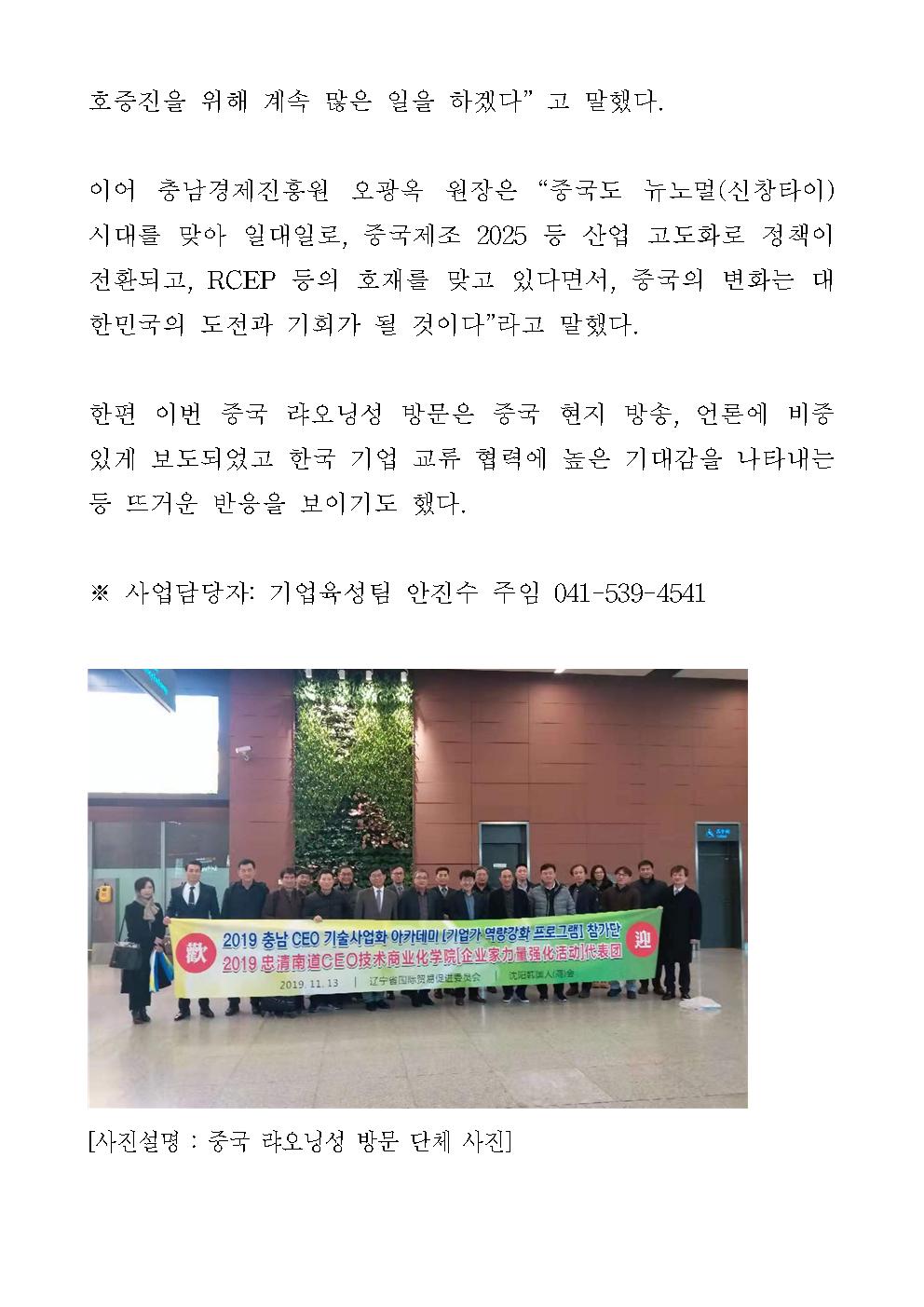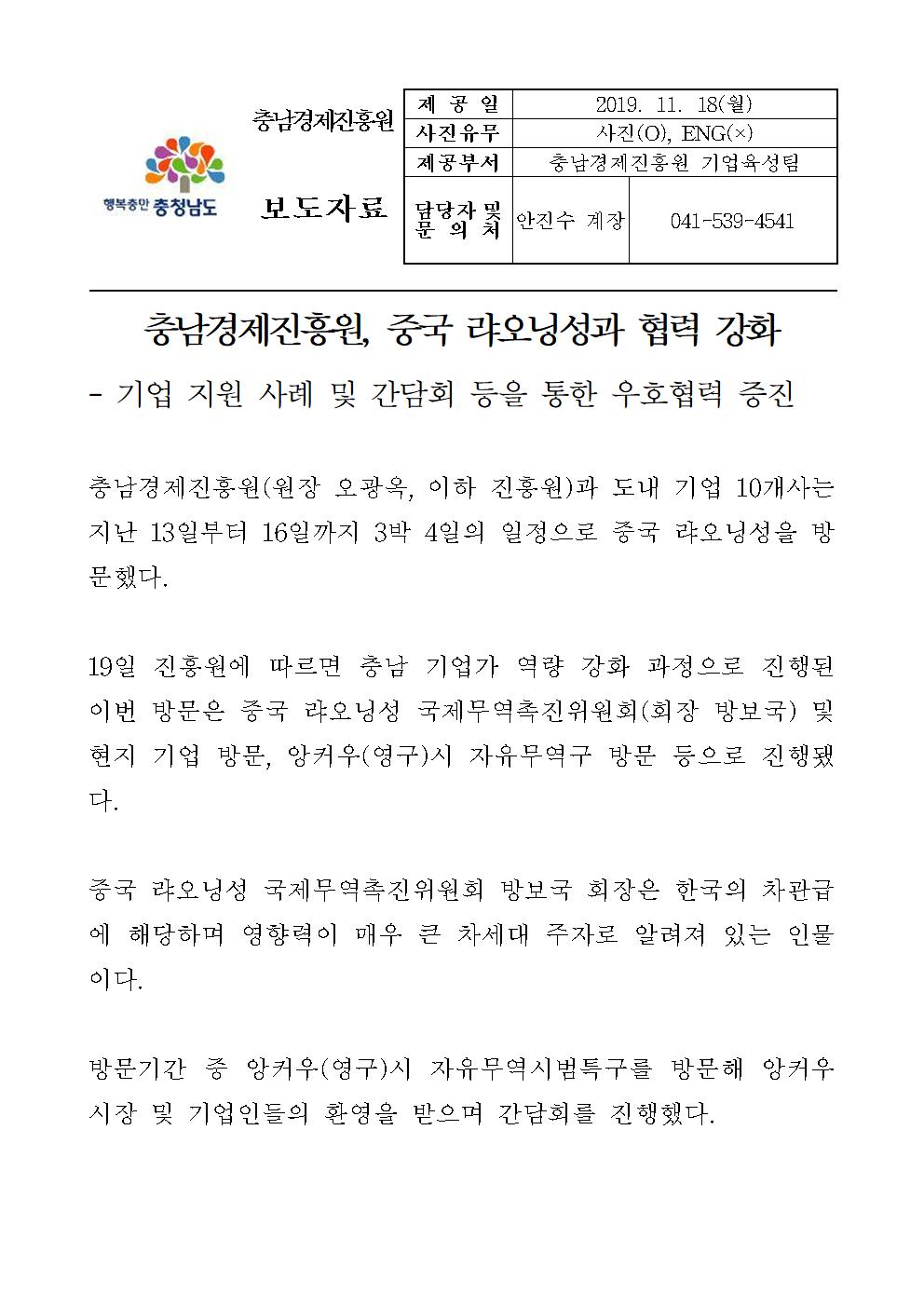 | 충남경제진흥원, 중국 랴오닝성과 협력 강화 [2019.11.19] | |||
