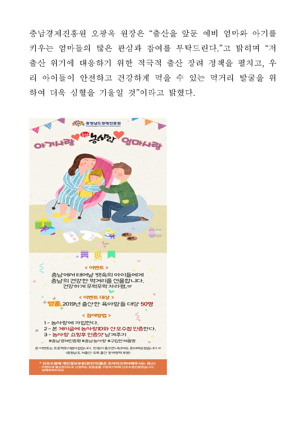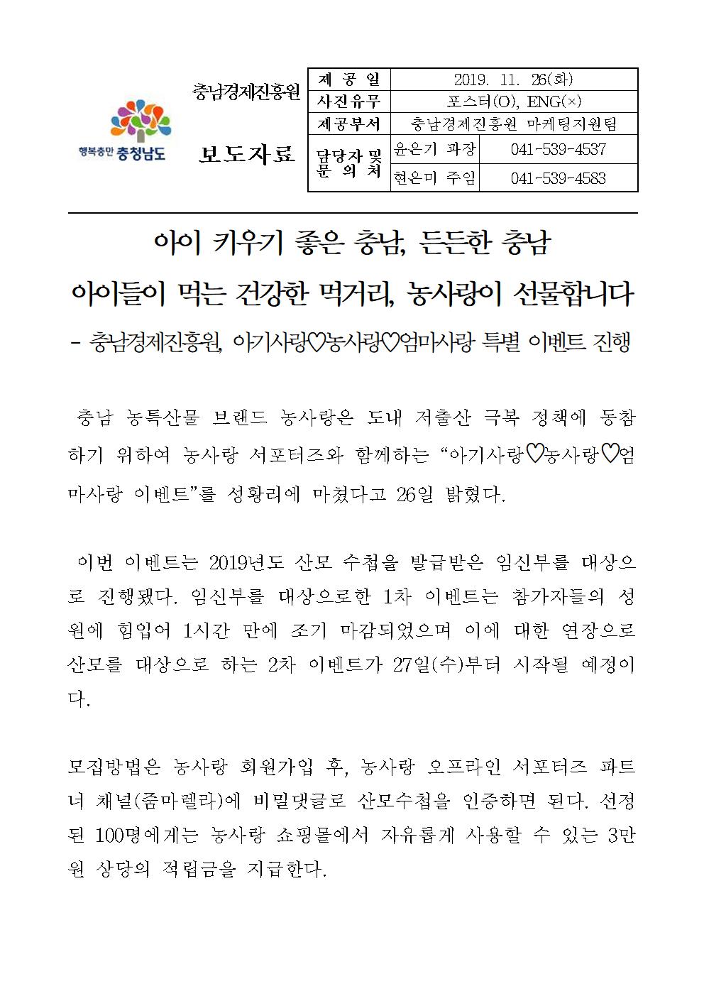 | 충남경제진흥원, 아기사랑 농사랑 엄마사랑 특별 이벤트 개최 [2019.11.27] | |||