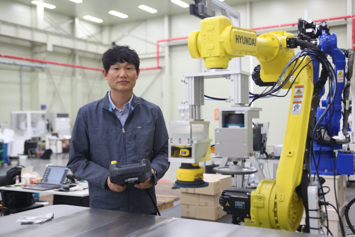 김진배 아라 대표가 천안 본사공장에서 고객사에 납품 예정인 로봇 설비를 점검하고 있다. 강태우 기자