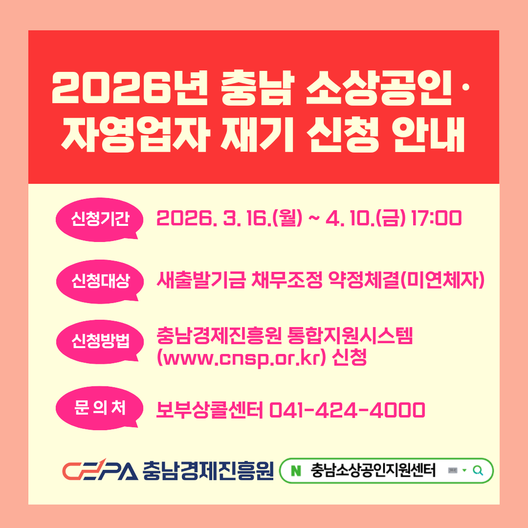충청남도와 소상공인자영업자새출발기금, 충남경제진흥원(원장 한권희, 이하 진흥원)이 협력하여‘2026년 충남 소상공인·자영업자 재기지원사업’참여업체를 모집중에 있다고 16일 밝혔다. 이번 사업은 도내 새출발기금 채무조정 약정을 체결한 후 성실하게 상환을 진행하는 분들을 대상으로 재기를 위한 사업화 자금을 지원하기 위해 마련되었다. 지원 규모는 30개 업체 내외로, 최소 100만원에서 최대 600만원까지 사업화자금을 지원받게 된다. 특히 이번 지원은 별도의 자부담 없이 전액 보조(부가세 제외) 방식으로 운영되어 채무조정 중인 소상공인·자영업자의 경제적 부담을 대폭 낮춘 것이 특징이다. 지원 항목은 매장 모델링(인터리어 등), 브랜드 개발, 마케팅 홍보, 온라인 판로 등으로 재기 지원을 위한 실질적인 지원 항목들로 구성되었다. 참여를 희망하는 소상공인·자영업자는 4월 10일(금) 17시까지 충남경제진흥원 통합지원시스템(www.cnsp.or.kr)을 통해 온라인으로 신청할 수 있다. 충남경제진흥원 한희철 일자리민생본부장은“새출발기금을 통해 재기를 꿈꾸는 소상공인·자영업자분들이 이번 사업을 통해 다시 한번 도약할 수 있는 발판을 마련하길 바란다”고 밝혔다. 사업에 관한 자세한 사항은 충남경제진흥원 및 충남소상공인지원센터 홈페이지 공고문을 확인하거나 보부상콜센터(041-424-4000)로 문의하면 된다. |