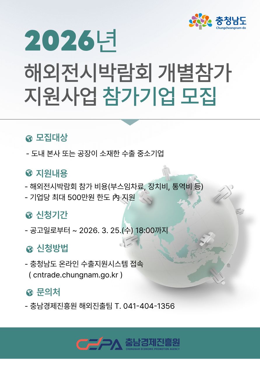 | 충남경제진흥원, 해외전시박람회 개별참가 지원… 참가기업 모집 | |||