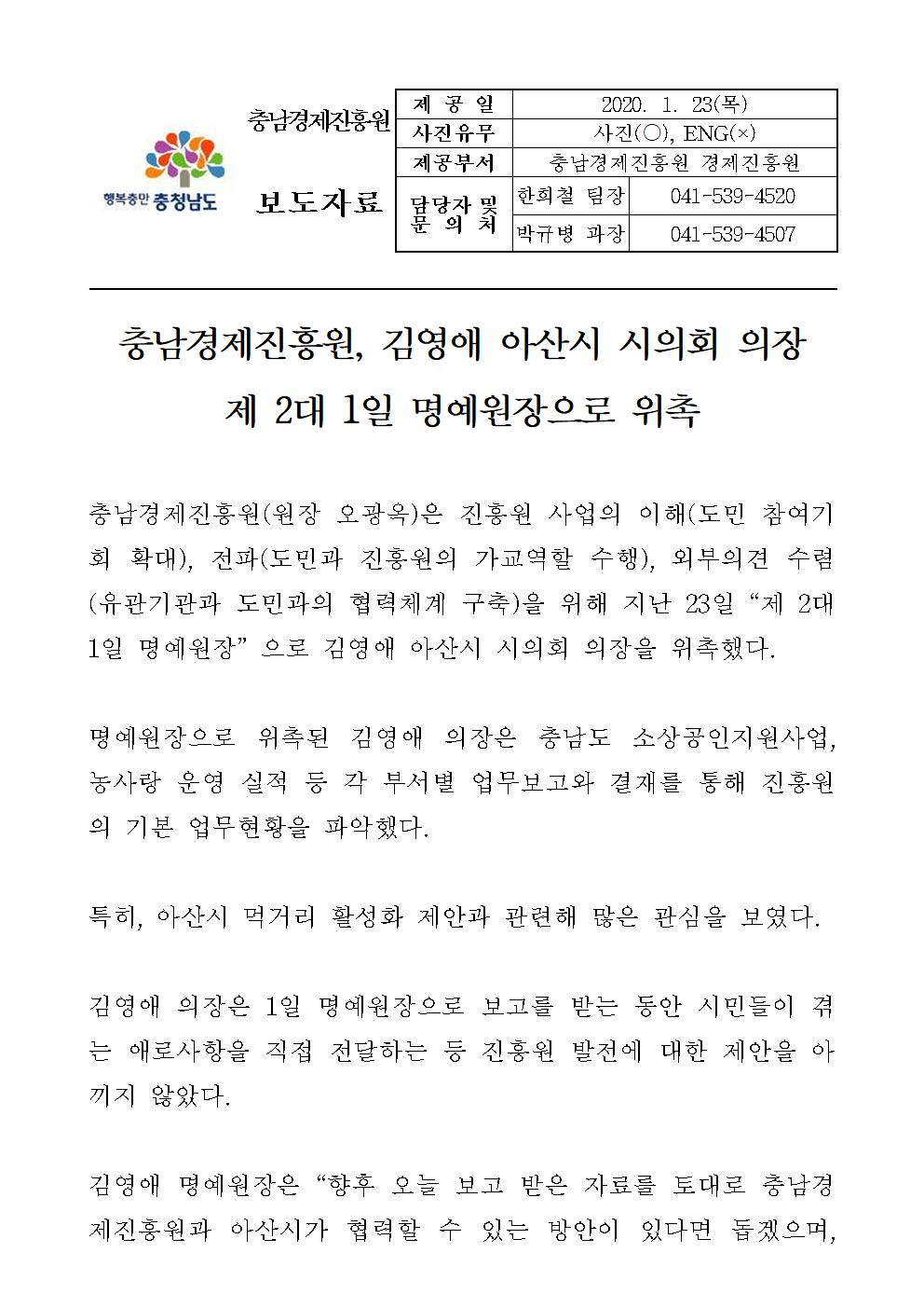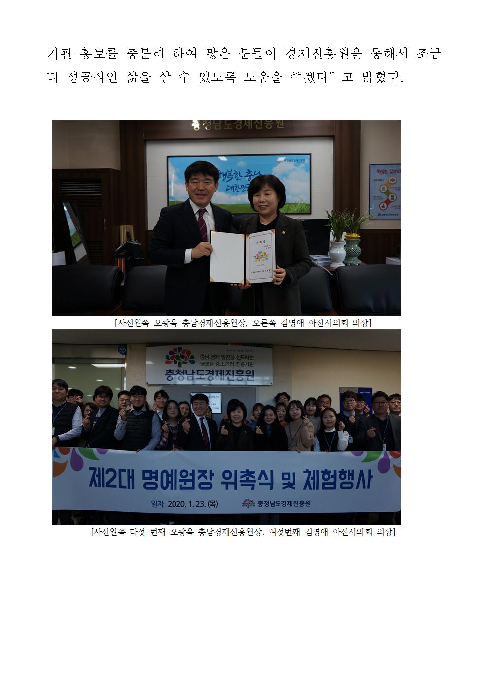 | 충남경제진흥원, 김영애 아산시의회 의장 제 2대 1일 명예원장 위촉 [2020.01.23] | |||