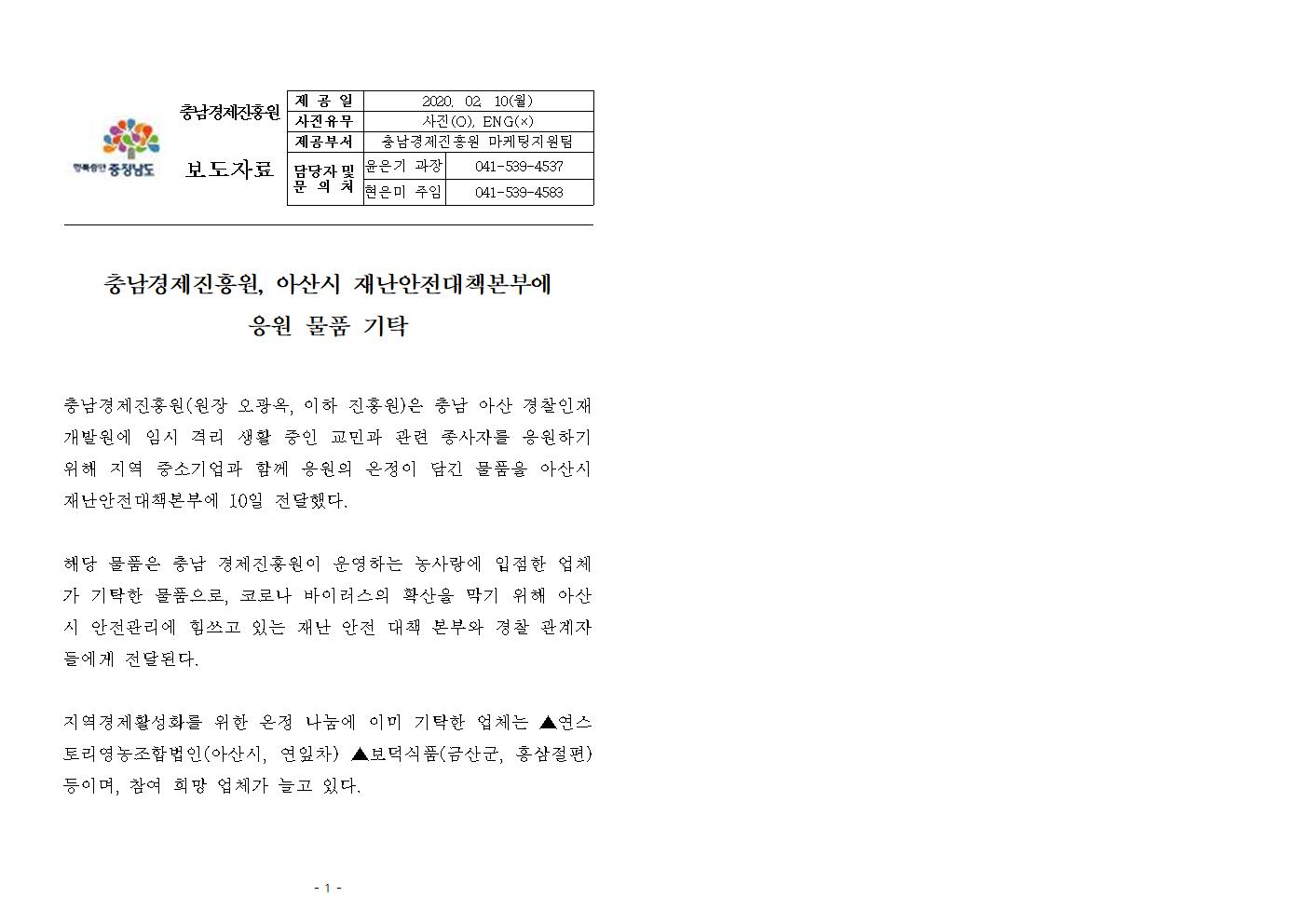 | 충남경제진흥원, 아산시 재난안전대책본부에 물품 기탁 [2020.02.10] | |||
