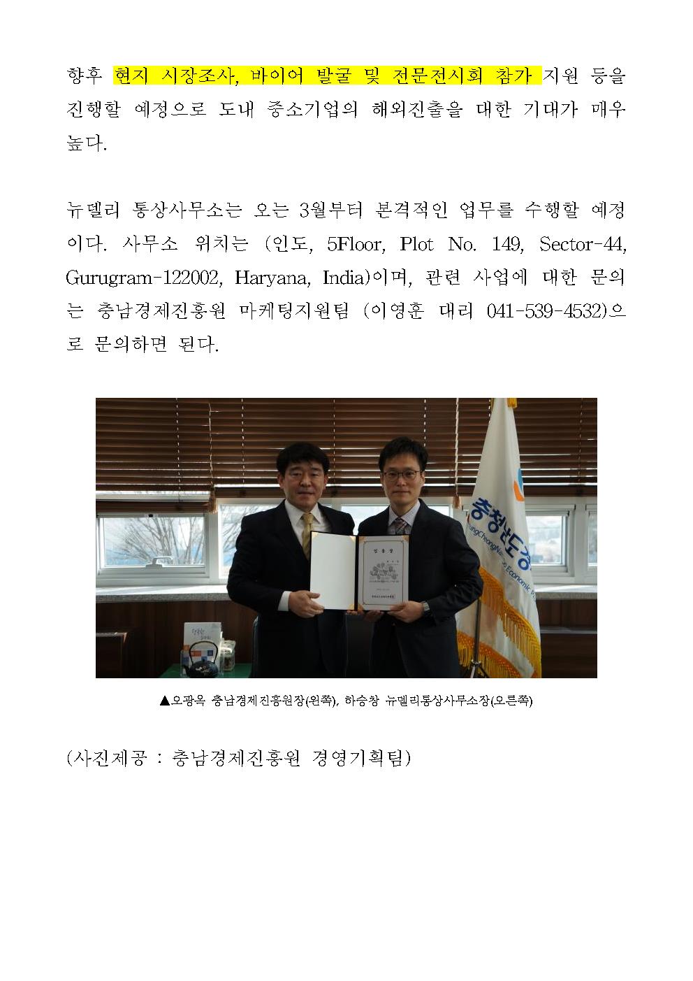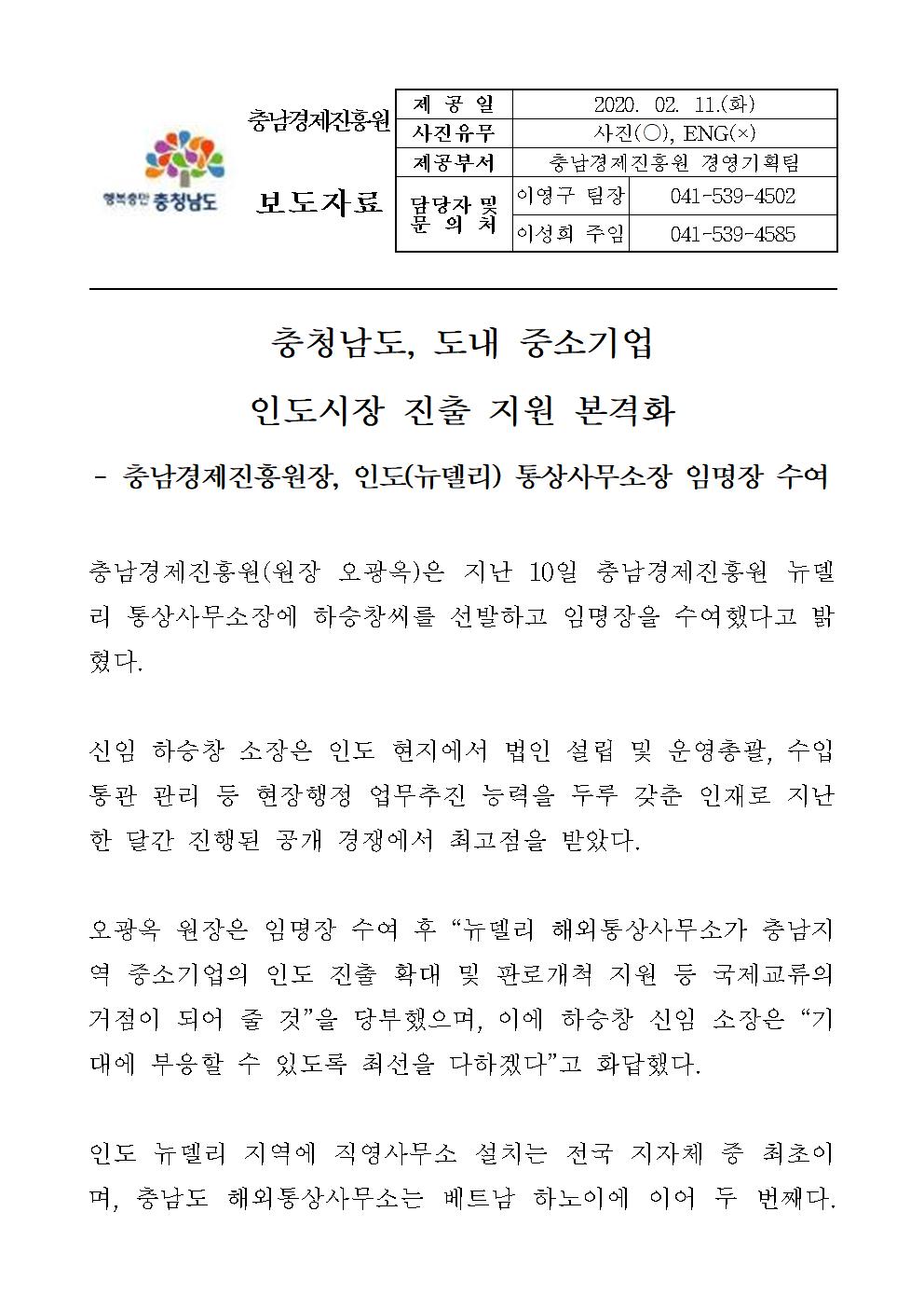 | 충남경제진흥원, 인도 뉴델리 통상사무소장 임용 [2020.02.11] | |||