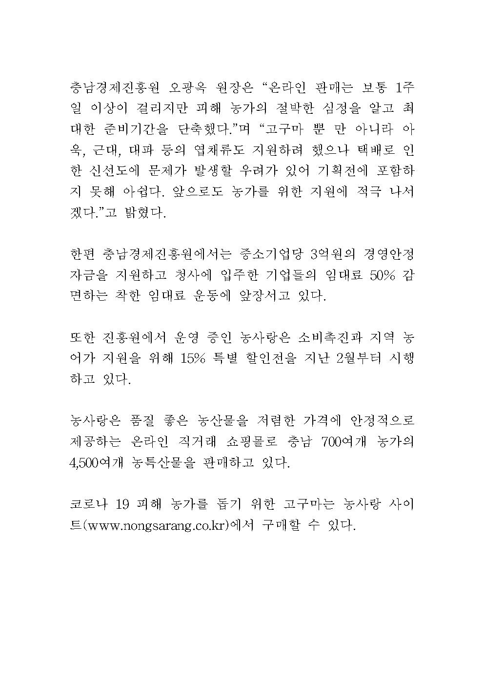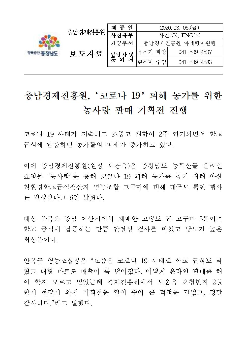 | 충남경제진흥원, 코로나 19 피해농가를 위한 농사랑 판매 기획전 진행 [2020.03.06] | |||