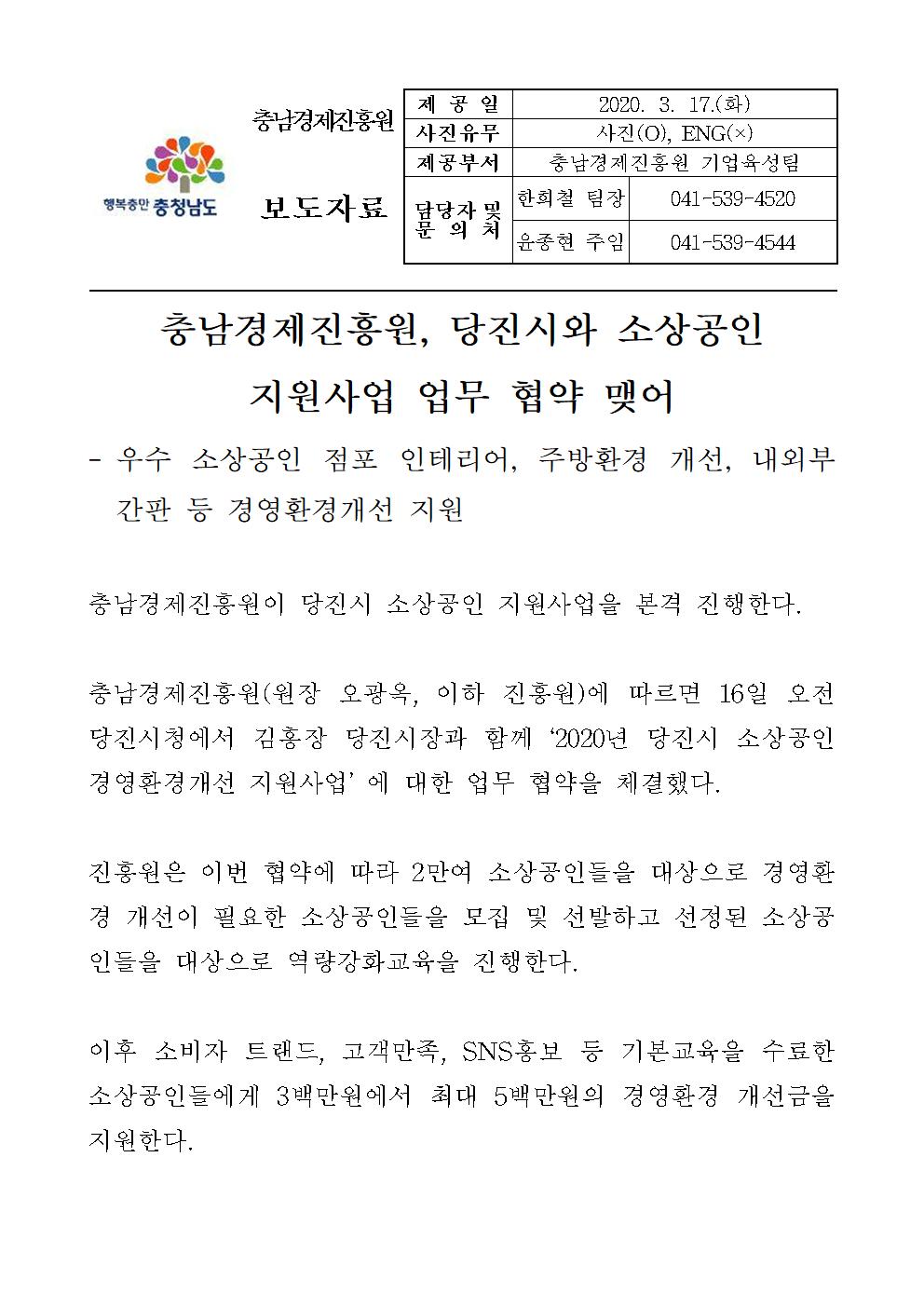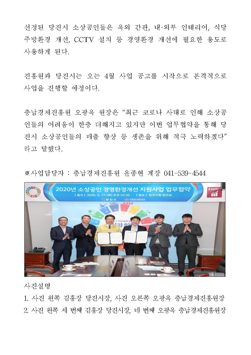 | 충남경제진흥원, 당진시와 소상공인지원사업 업무협약 맺어 [2020.03.16] | |||