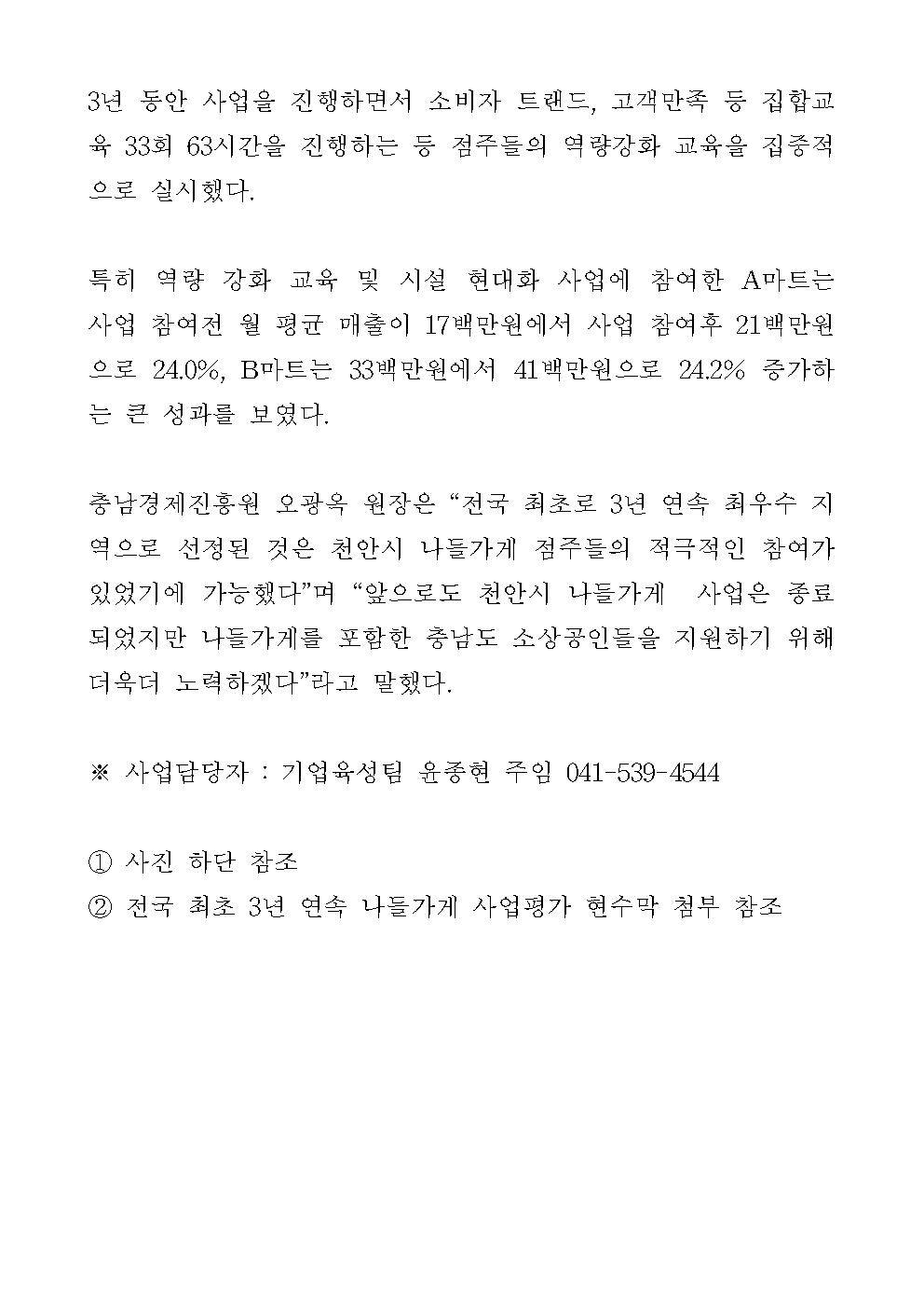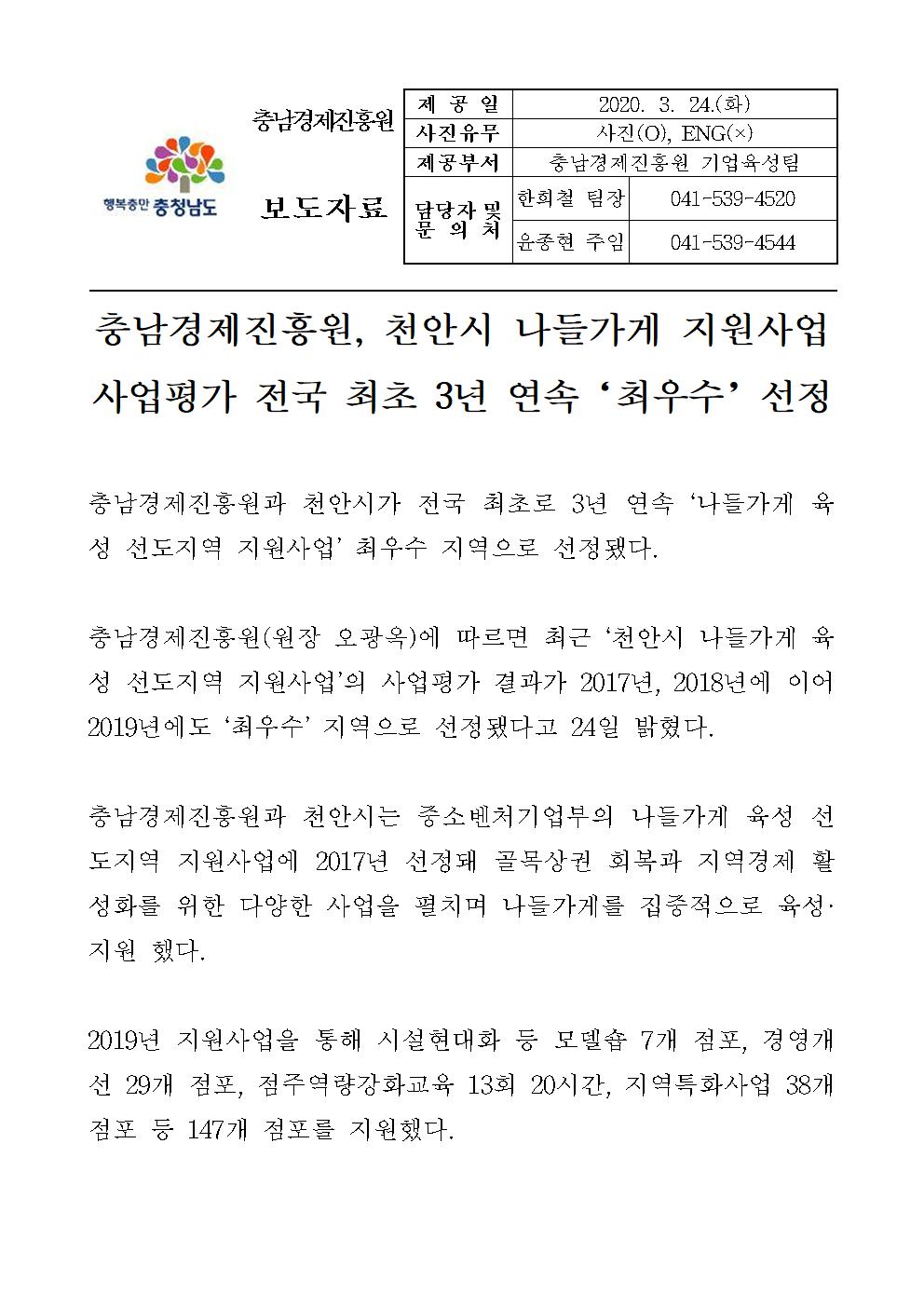 | 충남경제진흥원, 천안시 나들가게 지원사업 전국 최초 3년 연속 사업평가 '최우수' 선정 [2020.03.24] | |||