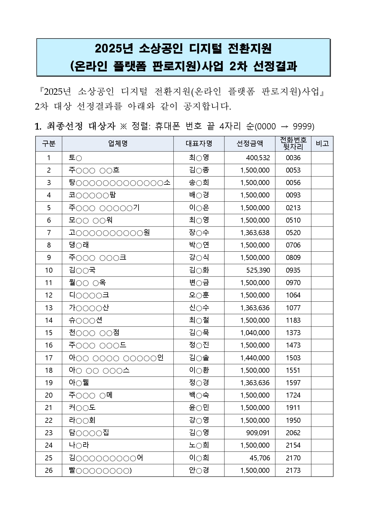 | 2025년 소상공인 디지털 전환(온라인 플랫폼 판로지원)사업 2차 선정결과 안내 |